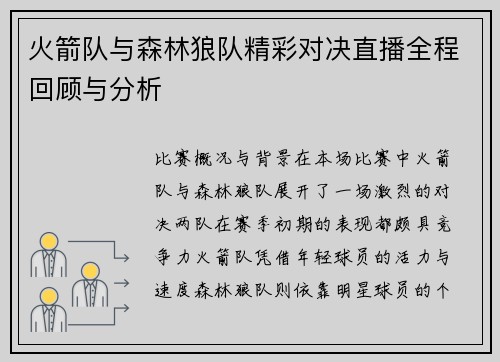 火箭队与森林狼队精彩对决直播全程回顾与分析