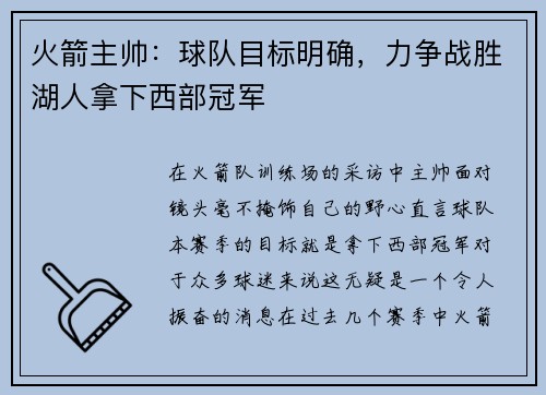 火箭主帅:球队目标明确,力争战胜湖人拿下西部冠军
