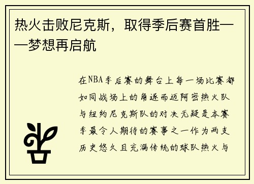 热火击败尼克斯,取得季后赛首胜——梦想再启航